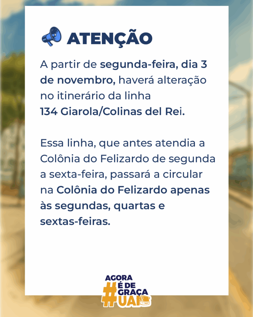 Alteração no Itinerário da Linha 134 Giarola/Colinas del ReiPor Viação Del Rei Ltda / outubro 31, 2025 Atenção, passageiros – COMUNICADO! Para mais Informações entre em contato por telefone ou E-mail